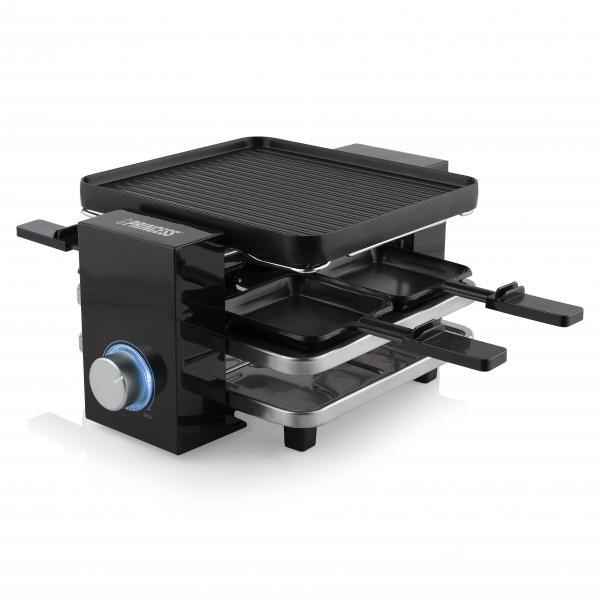 La raclette Piano Black 4 162915 de Princess es un utensilio dos en uno, ya que sirve para hacer raclette y cocinar alimentos a la plancha. Y eso es gracias a la superficie de cocción giratoria, que tiene dos caras: una lisa y otra acanalada. También viene con una base de apoyo en la que puede dejar las sartenes calientes para no ensuciar o quemar la mesa. Practicidad en su máxima expresión. Además, tiene una superficie de cocción de 21 x 23 cm, por lo que es la opción perfecta para cuatro comensales. Superficie de cocción giratoria de alta calidad Se acabó eso de tener que elegir entre raclette o plancha. Coloque la cara que quiera usar hacia arriba y listo. Ambas caras están hechas con aluminio de alta calidad que no se deforma y una capa antiadherente. Así, no tendrá que utilizar aceite ni mantequilla y podrá, por tanto, preparar comidas más saludables. Esta raclette negra será la protagonista de la mesa. No solo por su diseño, sino también por el termostato iluminado que, además, permite regular la temperatura. Base de apoyo para las sartenes Por lo general, las sartenes que están en uso se dejan encima de la mesa, lo que da lugar a manchas de aceite y quemaduras. La raclette Piano Black 4 de Princess tiene la solución: una práctica base de apoyo para las sartenes. Disfrute de una exquisita comida con su familia y amigos Un fin de semana con amigos, unas navidades en familia... Cualquier ocasión es perfecta para disfrutar de la raclette Piano Black 4 de Princess. La superficie de cocción de 21 x 23 cm es perfecta para cuatro comensales. La raclette incluye 4 sartenes y 4 espátulas de madera para darles la vuelta a los alimentos fácilmente. Además, tiene una potencia de 700 vatios que hace que la superficie se caliente enseguida y mantenga la temperatura durante toda la velada. Fácil de limpiar El revestimiento antiadherente de gran calidad evita que queden restos de comida adheridos a la superficie de cocción. Además, facilita la limpieza de la raclette Piano Black de Princess. Limpie la superficie con papel de cocina y deje que el lavavajillas se encargue del resto. Para limpiar las sartenes y las demás piezas, utilice un paño húmedo y líquido lavavajillas. Contenido de la caja: Raclette Piano Black 4 de Princess, 4 sartenes, 4 espátulas de madera, manual