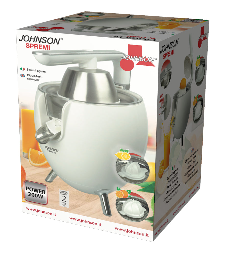 Johnson SpremiSPREMI di JOHNSON è il nuovo spremi agrumi elettrico ideale per spremere agrumi e poter avere a casa tua un succo sempre fresco senza essenze e coloranti, a differenza degli altri succhi in vendita sul mercato.Grazie ai 2 diversi coni di spremitura potrete spremere ogni tipo di agrume e con la valvola antigoccia posta internamente al beccuccio non verrà sprecata neanche una goccia.SPREMI è molto facile da pulire, basta rimuovere i coni, il filtro e il beccuccio e lavarli con acqua tiepida oppure anche in lavastoviglie. DATI TECNICI:SPREMI AGRUMI ELETTRICOPotenza : 200W.Beccuccio INOX2 diversi coni di spremituraValvola antigocciaCopertura antipolvereFacile da pulireColore: Bianco/AcciaioSpina italia