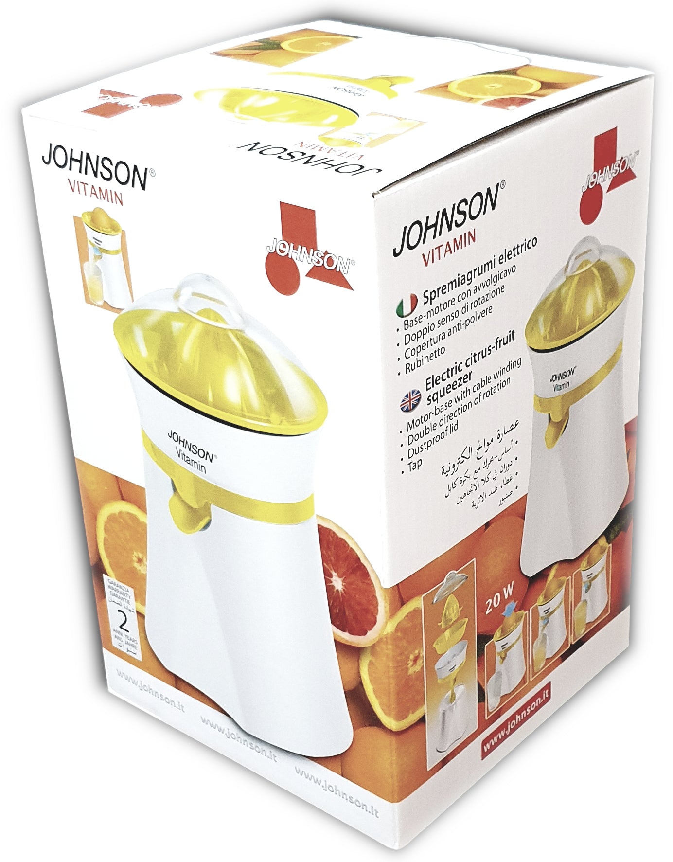 Johnson VitaminMolto semplice da usare, lo spremiagrumi VITAMIN di JOHNSON è completamente smontabile per premettere una veloce ed accurata pulizia dopo ogni utilizzo.Dotato di rotazione automatica con attivazione a pressione e di rubinetto di sicurezza, VITAMIN viene fornito con un coperchio trasparente per proteggere e mantenere pulito il cono di spremitura.DATI TECNICI:Potenza 20WSpremi agrumi elettricoDoppio senso di rotazioneCopertura anti-polvereRubinettoBase-motore con avvolgicavoColore: Bianco/Giallo e Bianco/Rosso