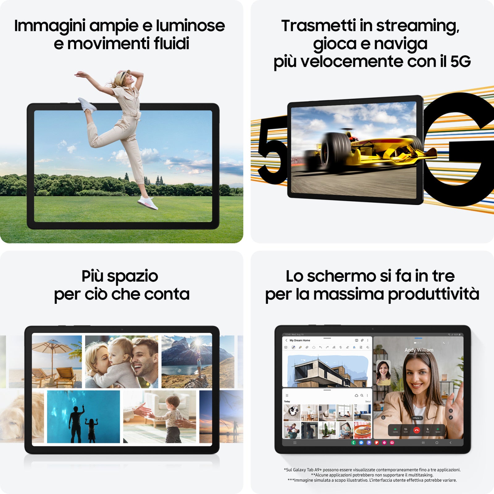 Samsung Galaxy Tab A9+, display 11", 256GB, 8GB RAM. Ideale per multitasking e intrattenimento in mobilità. Audio Dolby Atmos, leggero e performante.