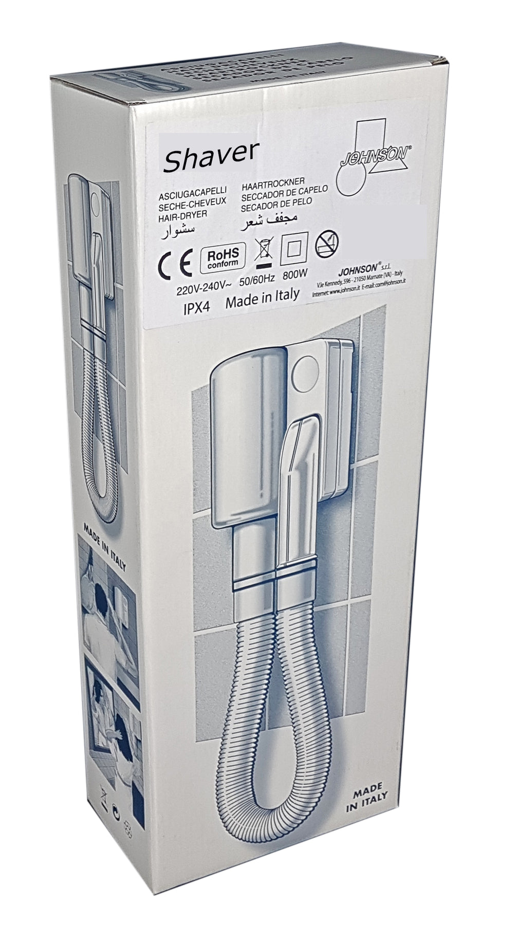 ASCIUGACAPELLI DA PARETE - SHAVERJOHNSONMOD. SHAVERCARATTERISTICHEStudiato per comunitàPotenza: 800 WAvviamento automaticoSupporto con speciale aggancio di sicurezzaTimer e presa per rasoio: americana a 120 V, europea a 230 VDimensioni orientative: H 61 x L 13 x P 9 cm circaAlimentazione: 230 Volt 50 Hz