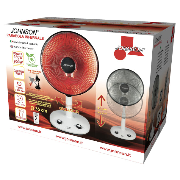 Stufa in fibra di carbonioPotenza: 450-900 WBasso consumo a risparmio energetico ad alta efficienza termica – Potenza regolabile – Timer 0 -120 minuti – Inclinazione regolabile – Oscillazione automatica selezionabile – Altezza regolabile 70 – 90 cm – Parabola riflettente e griglia in metallo – Maniglia di trasporto – Sistema di sicurezza di spegnimento automatico in caso di ribaltamento dell’apparecchioColore: Bianco 450 - 900 W, sistema di spegnimento automatico, inclinazione regolabile. Potenza: 450-900W, Dimensioni: 35 x 35 x 70/90 cm, Peso confezione: 3.5 Kg."