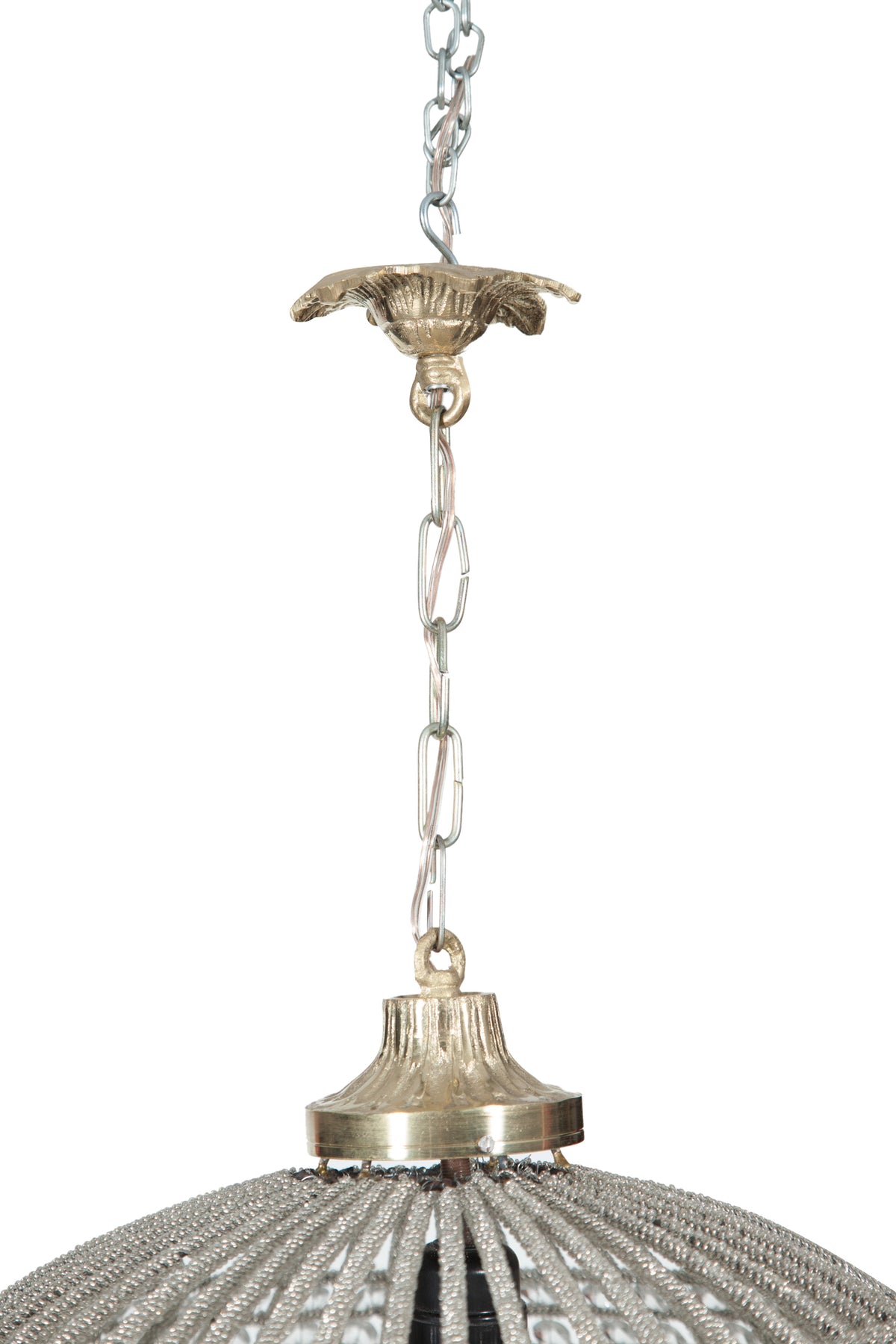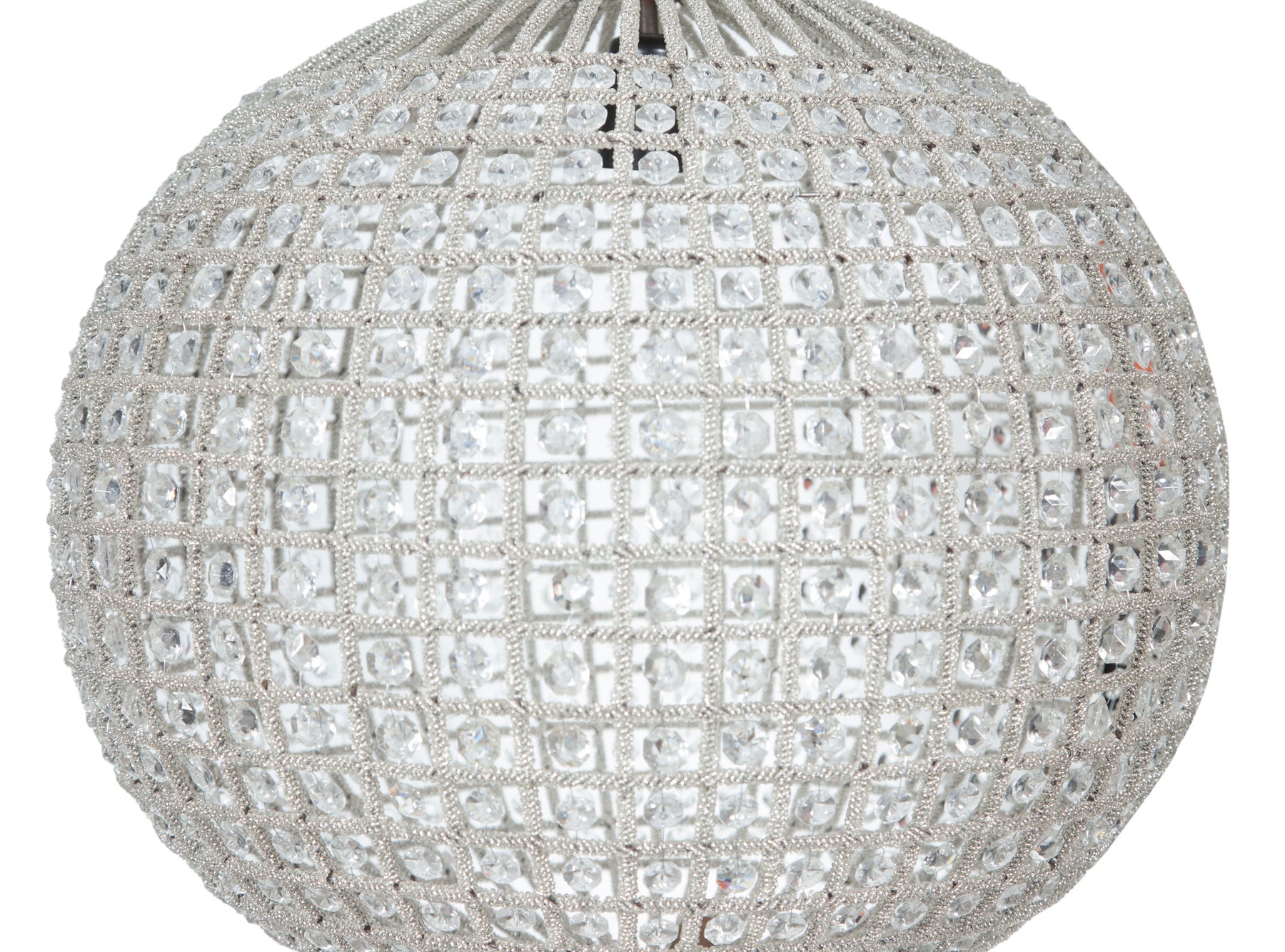 Lampadario con struttura in fusione di ottone con gemme di cristallo sapientemente rilegate a mano con filo di acciaio. Queste ultime per il loro potere riflettente amplificano la luce diffusa. Dimensioni Diam. 40XH40 cm.