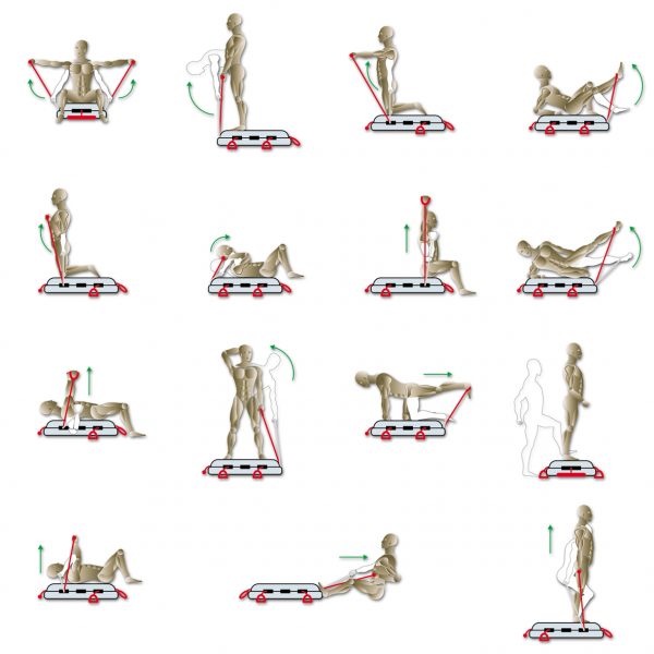 Attrezzo composto da una base d’appoggio (che può essere usata come step, pedana o panca), con tappetino antiscivolo, nel cui interno sono inserite:4 serie da 3 elastici corti (2 serie per ogni lato lungo),2 serie da 3 elastici lunghi (1 serie per ogni lato corto) a resistenza differenziata. Stop colorati alle estremità degli elastici indicano la loro diversa resistenza:GIALLO = leggeraROSSO = mediaVIOLA = pesanteVERDE = molto pesante L’attrezzo è equipaggiato di:1 doppia cavigliera con aggancio a moschettone,1 barra vogatore con aggancio a moschettone e impugnature in soffice schiuma,4 impugnature a manopola con aggancio a moschettone.DIMENSIONI: 96 x 51 x H 20 cm.PESO: 8.5 kg.PESO MASSIMO ATLETA: 100 kg.