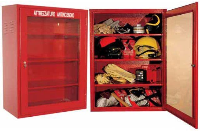 Nome: armadio per dispositivi di protezione individuale DPIDotazioni di serie: n° 1 armadioCaratteristiche del prodotto:- struttura portante realizzata in lamiera FE 42 spessore mm. 10/10- n° 3 ripiani regolabili in altezza- n° 1 serratura con n° 2 chiavi- n° 1 adesivo simbolo di identificazione- n° 1 lastra non frangibile in policarbonato trasparente- n° 1 cassetta portachiavi con sigillo di sicurezza e lastra infrangibile contenente la chiave di apertura dell'armadioDimensioni esterne (LXPXH) cm.: 73x40x100hColore: rosso RAL 3000Installazione: monobloccoConformità: -Tempi di approntamento: affidato al corriere in 2-4 gg. lavorativi salvo esaurimento scorte (altrimenti 5 gg. lavorativi)Tempi di consegna del corriere: 2-5 gg. lavorativi / 7 gg. lavorativi per IsoleDestinazione d’uso: internoInformazioni utili: -Dettagli aggiuntivi o richieste dovranno essere inserite nelle NOTE dell’ordine o inviate ad info@castellanishop.it