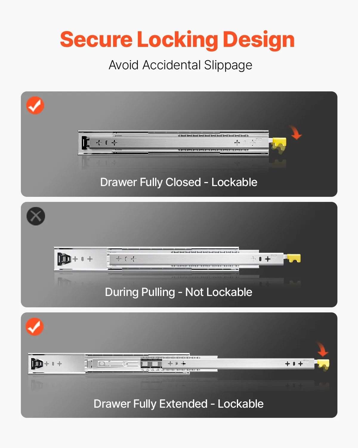 - Design a chiusura: le guide per cassettiere a estensione completa sono dotate di un design a chiusura che blocca le guide con una semplice pressione, assicurando che i tuoi oggetti siano al sicuro e non scivolino via nemmeno su strade sconnesse