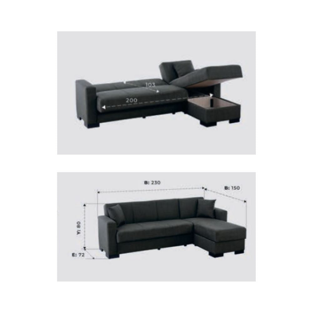 Divano letto Dugo con penisola contenitore reversibile in tessuto Mina 07 tortora e piedini cromo