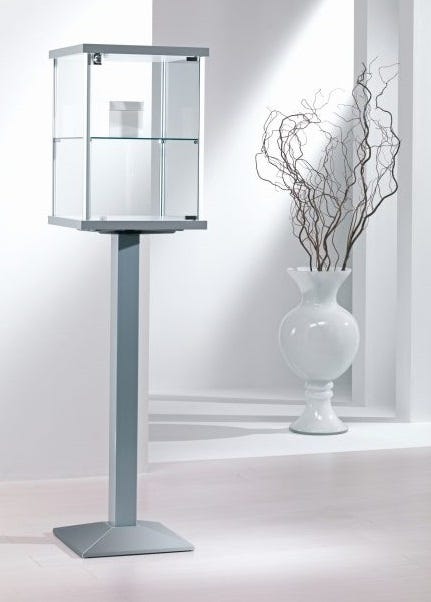 Nome: vetrina con piantana in metallo 45x45x154h Dotazioni di serie: n° 1 vetrina Caratteristiche del prodotto: - vetrina con piantana- n° 1 piano interno regolabile - cristallo temperato mm. 5 - profili antipolvere in alluminio- piantana in ghisa o cromata a scelta dal menù a tendina- altezza piantana (H) cm. 110h - anta a battente dotata di serratura a chiave - base in legno di spessore mm. 30 Dimensioni esterne (LXPXH) cm.: 45x45x153h; interno teca (LXPXH) cm. 40x40x37h Colore: base e top silver Installazione: in kit di montaggio con pratiche istruzioni Conformità: UNI EN ISO 9001; CISQ; IQNET Tempi di approntamento: affidato al corriere in 7-10 gg. lavorativi circa Tempi di consegna del corriere: 2-5 gg. lavorativi / 7 gg. lavorativi per Isole dall'affidamento al corriere Destinazione d’uso: interno, negozio Informazioni utili: tutte le parti in legno sono prodotte rispettando la nuova normativa “CARB 2” (a ridottissima emissione di formaldeide e quindi non nociva alla salute); tutte le vetrine, onde rispettare normative antinfortunistiche, sono realizzate con cristalli di sicurezza e temperati; possibilità di acquistare piantana cromata e illuminazione alogena o LED nei prodotti associati; su preventivo produciamo vetrine in cristallo extrachiaro ideali per la casa Dettagli aggiuntivi o richieste dovranno essere inserite nelle NOTE dell’ordine o inviate ad info@castellanishop.it